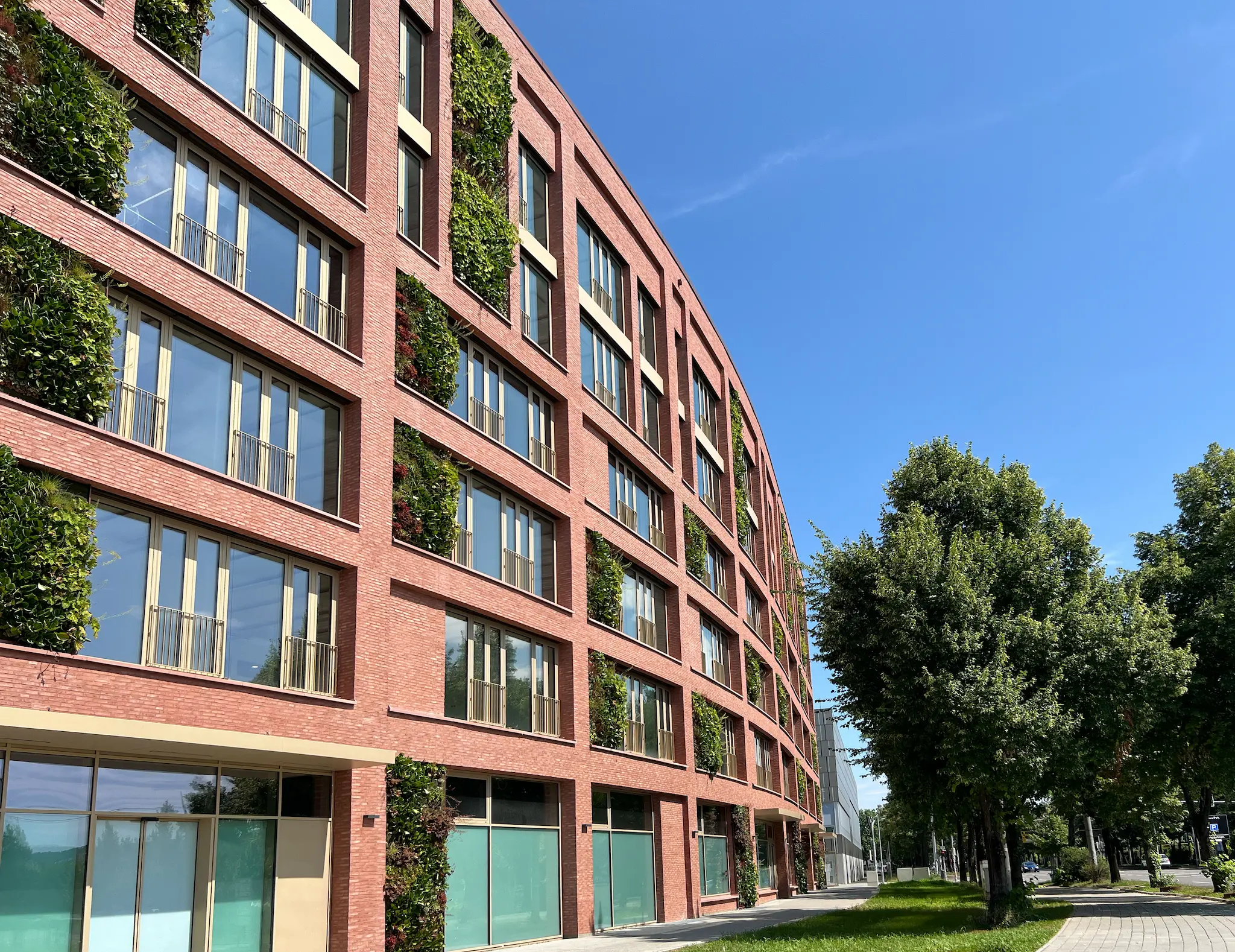 Im Fokus der Fassadenbegrünung standen, neben der Schaffung eines kontrastierenden Farbspiels der roten Klinkerfassade und den grünen Pflanzenflächen an den Außenfassaden, sowie dem stilvoll begrünten Innenhof, auch gleichzeitig die Bildung eines optimalen Mikroklimas für die Gebäude und Umgebung.
